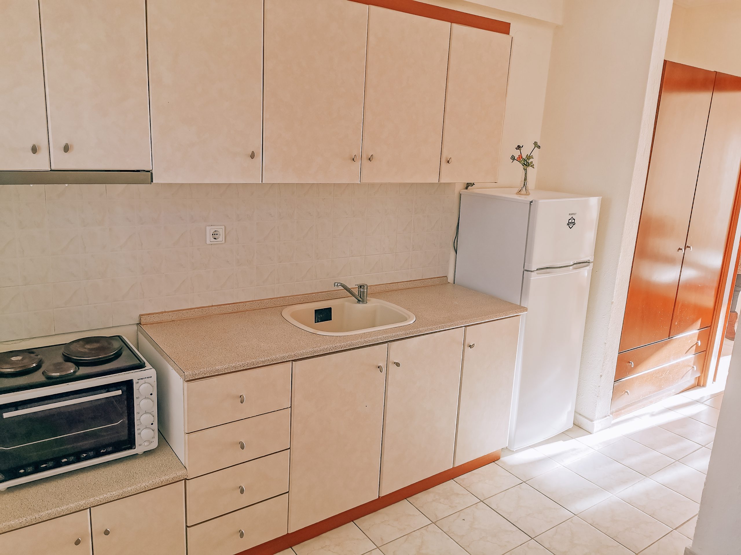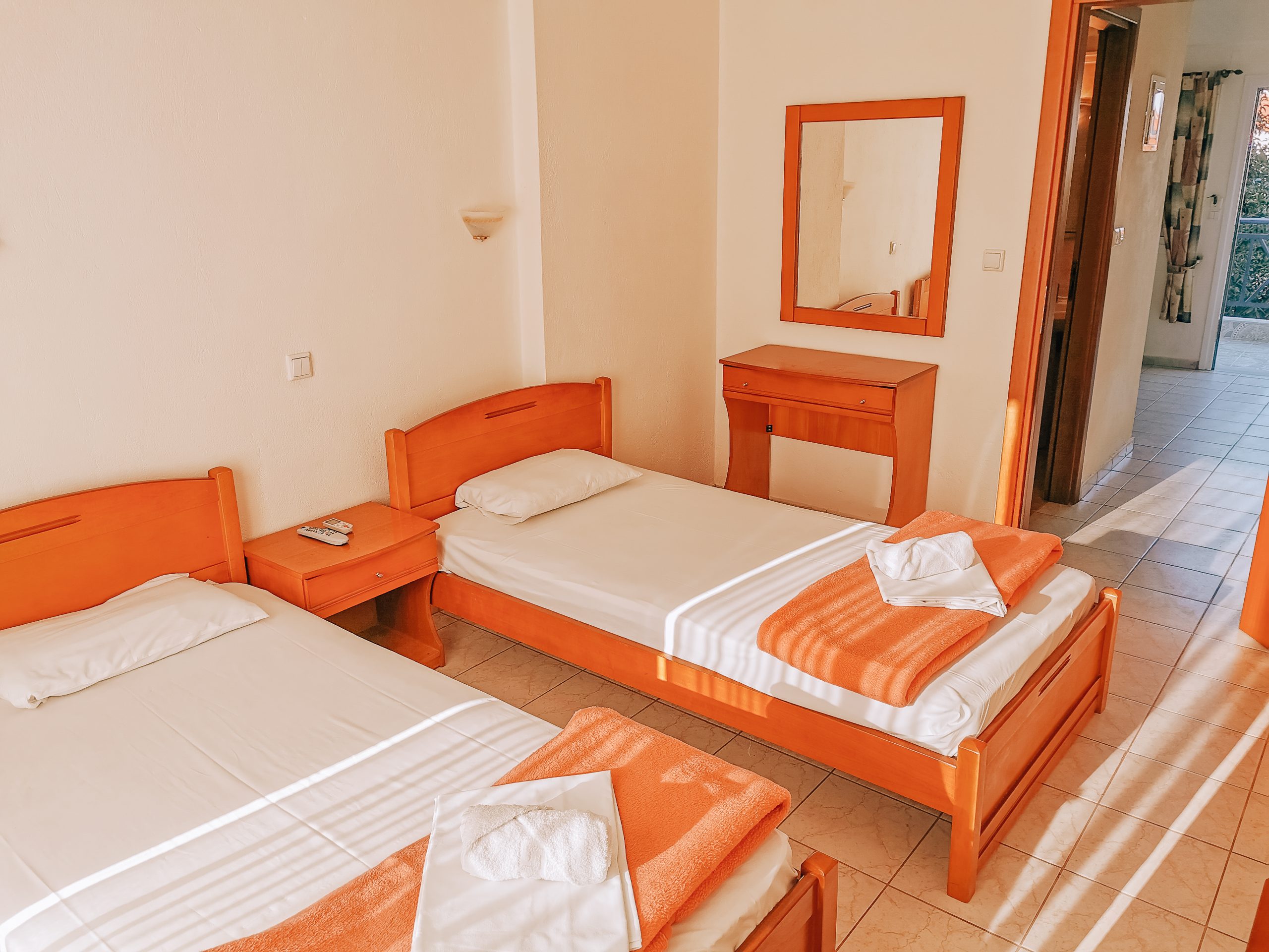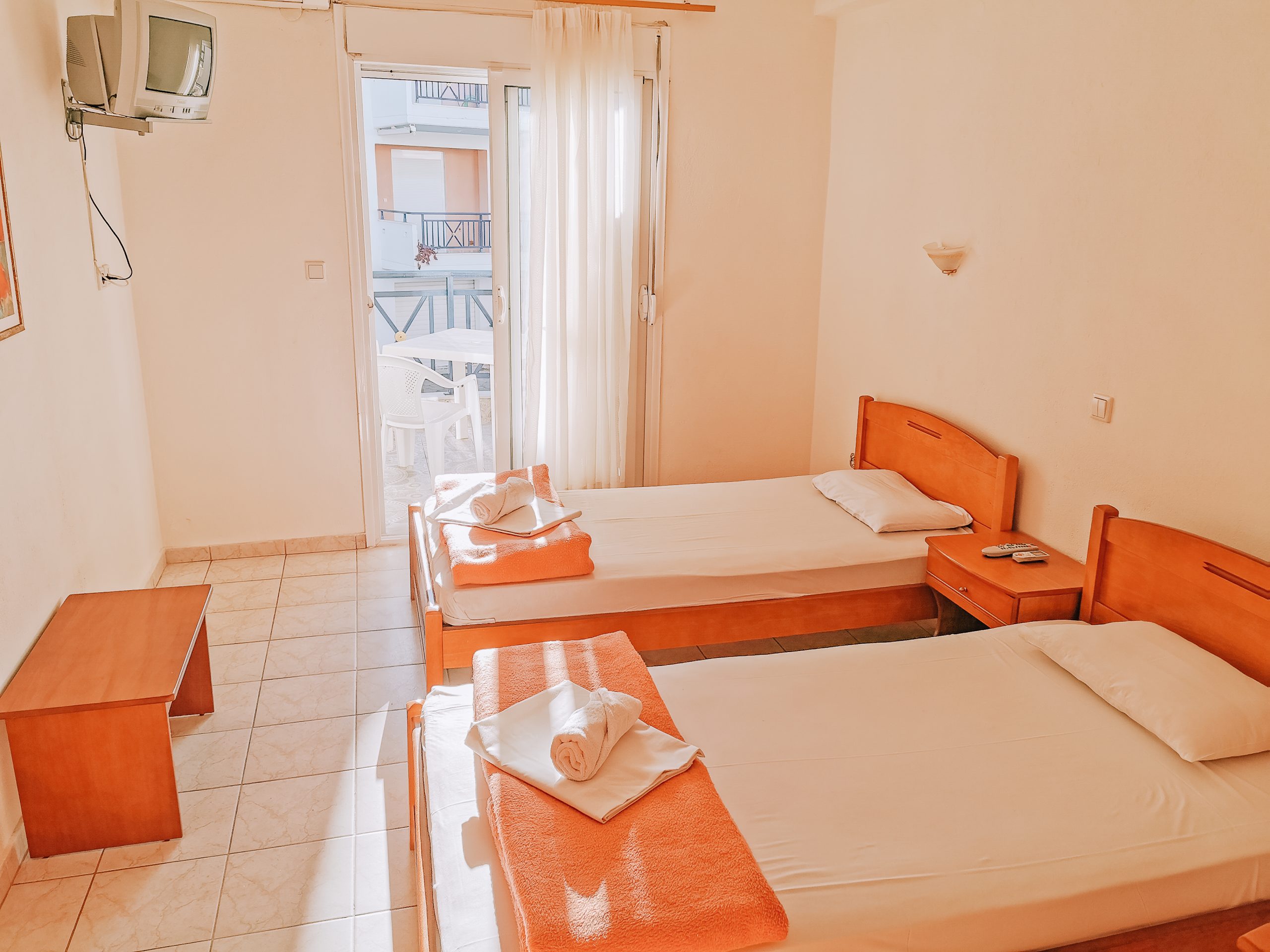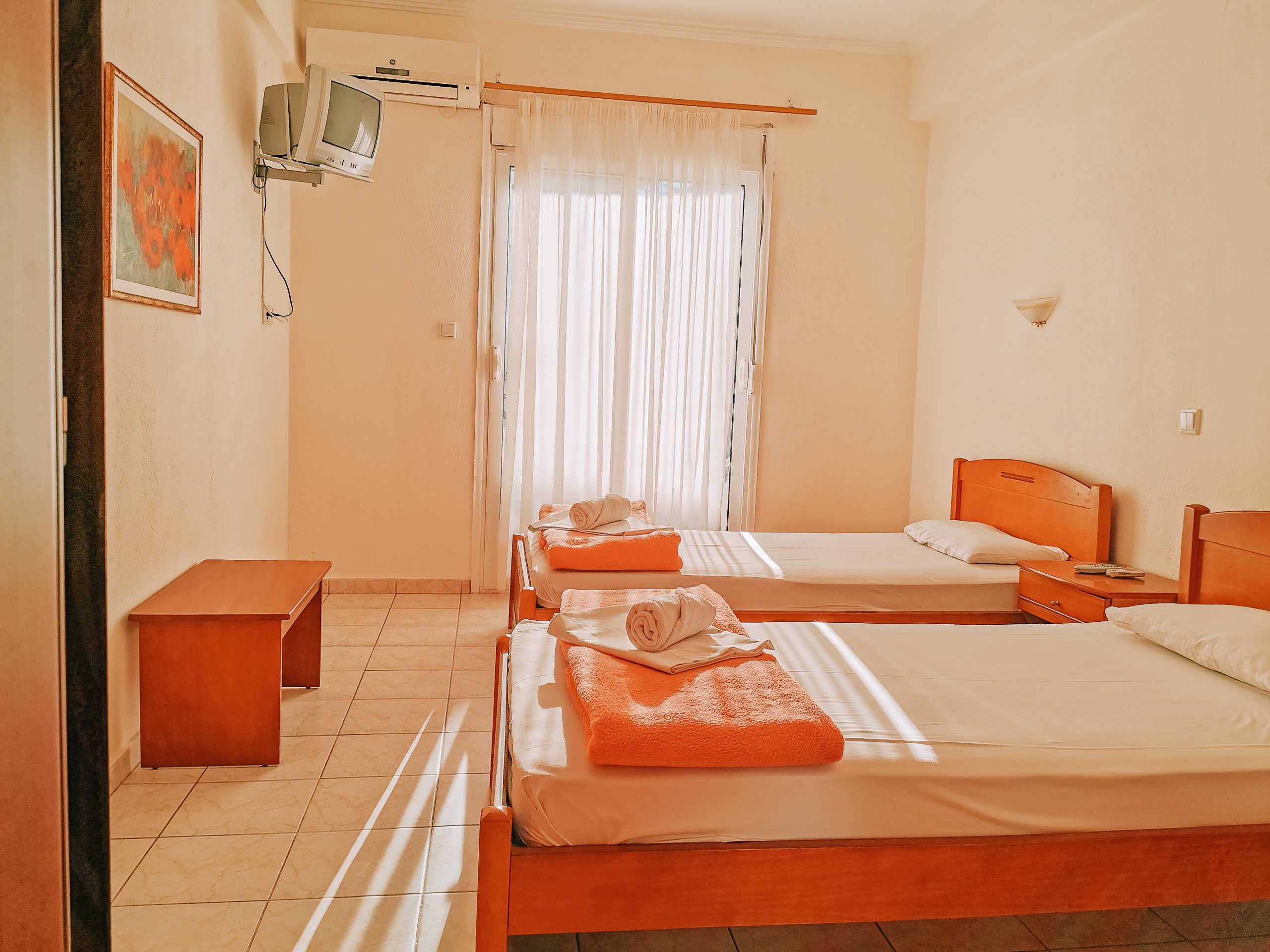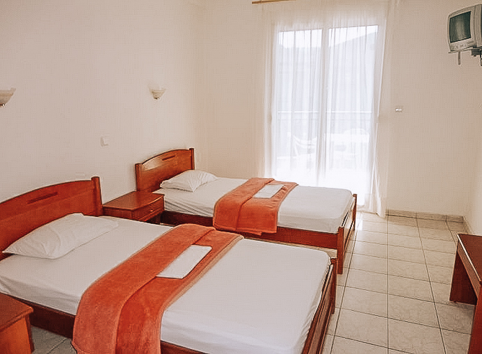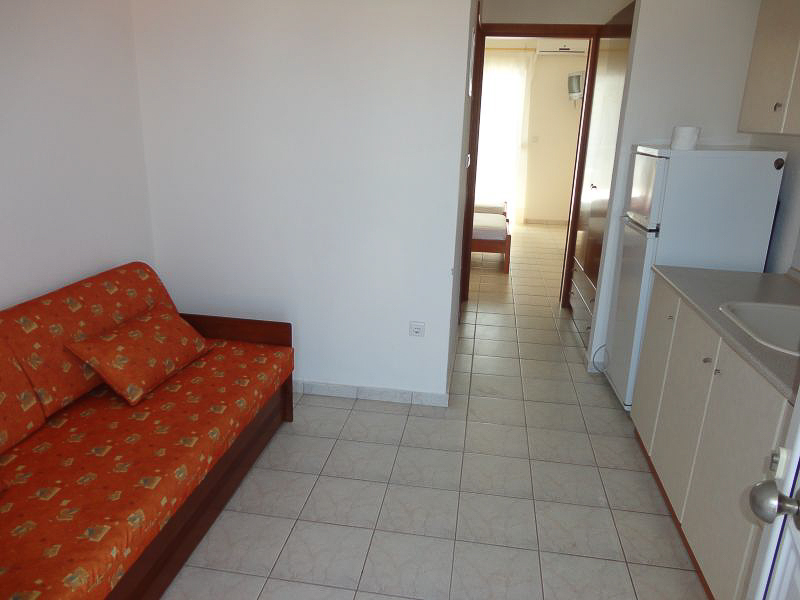 Секој апартман е опремен со мини кујна, бања, балкон и ТВ. Во спалната има два одвоени кревети и во кујната има кревет на спуштање.. Користењето на климата е вклучено во цената.