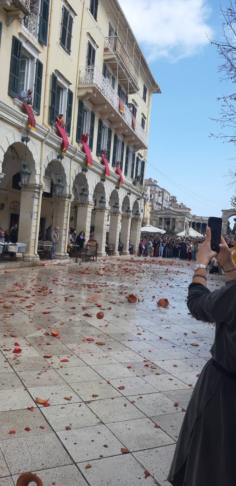 Овој ден е резервиран за вториот дел од Велигденската прослава, односно првата поворка наречена, првото Воскресение кое започнува во 09.00 часот. Под строга заштита, се изнесуваат моштите на Св.Спиридон Чудотворец – заштитник на островот. Има повеќе легенди поврзани со овој светец кои ја објаснуваат вербата и почитта на народот кон него. Една од нив го споменува неговото влијание при повлекувањето на турската инвазија од островот. Тој се појавувал напомош на генералите кои се бореле да го ослободат островот. Облечен во темна наметка со запален факел влевал страв во умот на освојувачите наметнувајќи им опасност од натприродни сили. Во друга легенда пак, повторно се спомнува неговото херојство при бркање на опасната чума од градот, која бегајќи ги оставила своите траги на градските ѕидини. Под звуците на свечената музика составена од три филхармонии, пред моштите на светецот луѓето фрлаат каранфили со кои го постилаат неговиот пат. Откако ќе заврши парадата, почнуваат подготовките за еден оригинален локален обичај – кршење на глинените ќупови. Точно во 11:00 часот, црковните ѕвона го означуваат „утринското воскресение“ и од прозорците на куќите почнуваат да се фрлаат глинени садови полни со вода, во знак на почнување на празникот и истерување на злото. Ова потекнува од стар венецијански обичај со кој за дочекот на новата година се ослободувале старите работи да направат простор за нови и подобри. Друго објаснување за овој обичај е дека има паганско потекло и дека со вревата направена од кршењето, Античките Грци сакале да ја разбудат Персефона, божицата на пролетта и да го забрзаат нејзиното доаѓање. Обичајот е да се земе парче од скршените глинени садови и да се сочува за среќа и здравје до следната година. Филхармонските групи се враќаат на улиците и почнуваат да свират весела музика. Во договорено враќање во сместување. Во вечерните часови поаѓање кон градот Крф за проследување на последниот дел од традиционалната прослава, односно Христовото Воскресение. На полноќ, илјадници луѓе се собираат на градските плоштади и го прославуваат Христовото Воскресение со спектакуларен огномет. Враќање во сместување. Ноќевање.